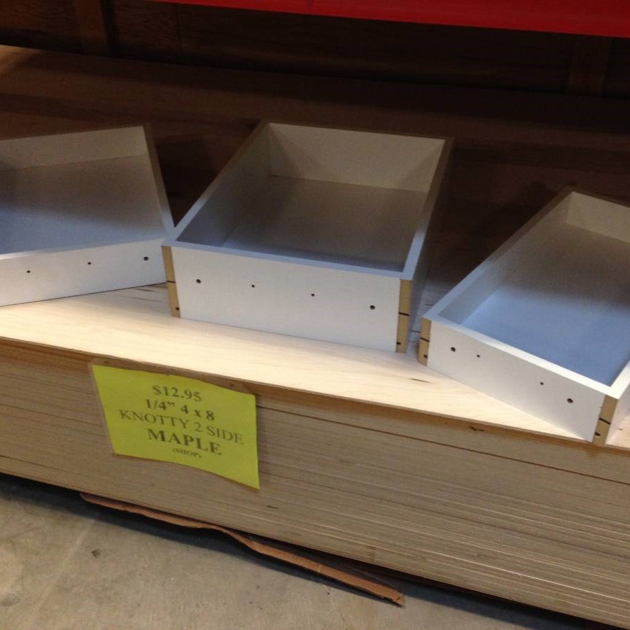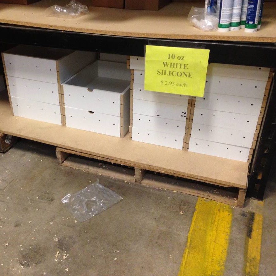 We currently have many white melamine drawer boxes. The boxes are constructed with 5/8″ melamine coated MDF.